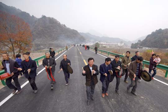 11月10日,大別山旅游扶貧快速通道水毀修復(fù)工程漁潭段改線建成通車(chē)。當(dāng)?shù)卮迕袂描尨蚬摹⑤d歌載舞,以自己特有的方式歡慶這一時(shí)刻的到來(lái).